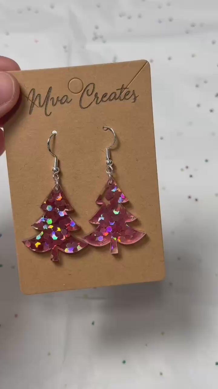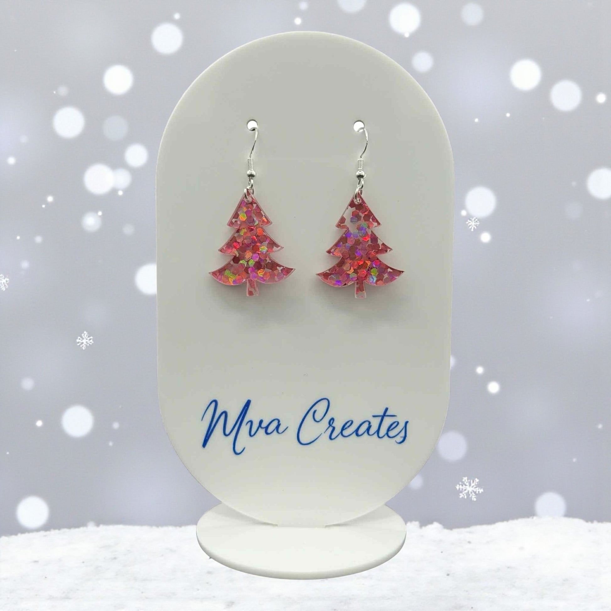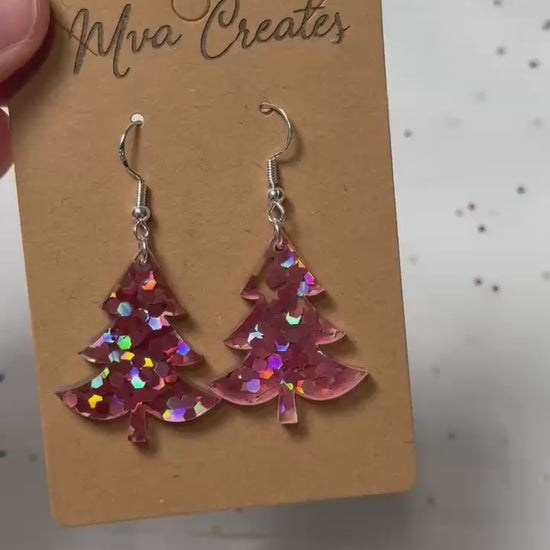 Pink Glitter Christmas Tree Earrings | Sparkly Holiday Acrylic Jewelry | Handmade Festive Gift for Her