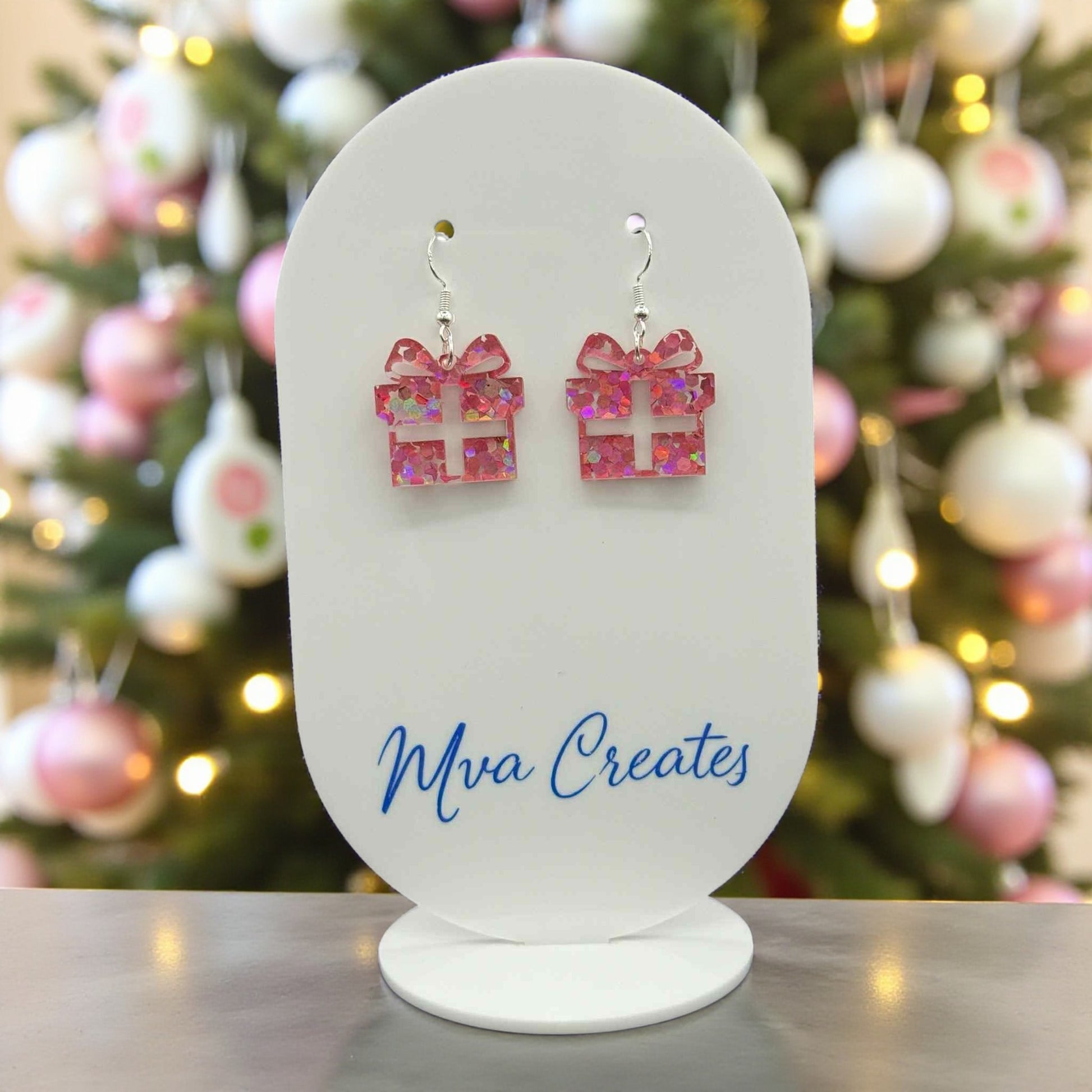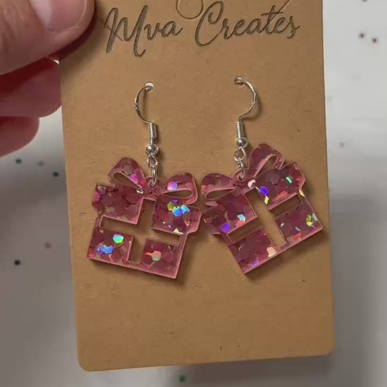 Pink Glitter Gift Box Earrings | Holiday Acrylic Earrings | Festive Jewelry Gift