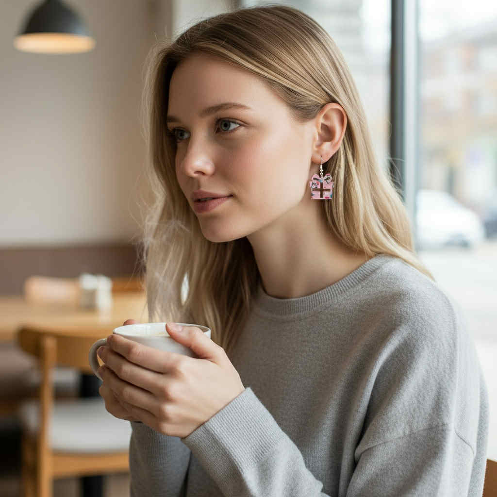 Each earring features adorable penguins in Santa hats nestled inside a pink gift box design β a playful, cheerful accessory perfect for adding sparkle to your festive style.