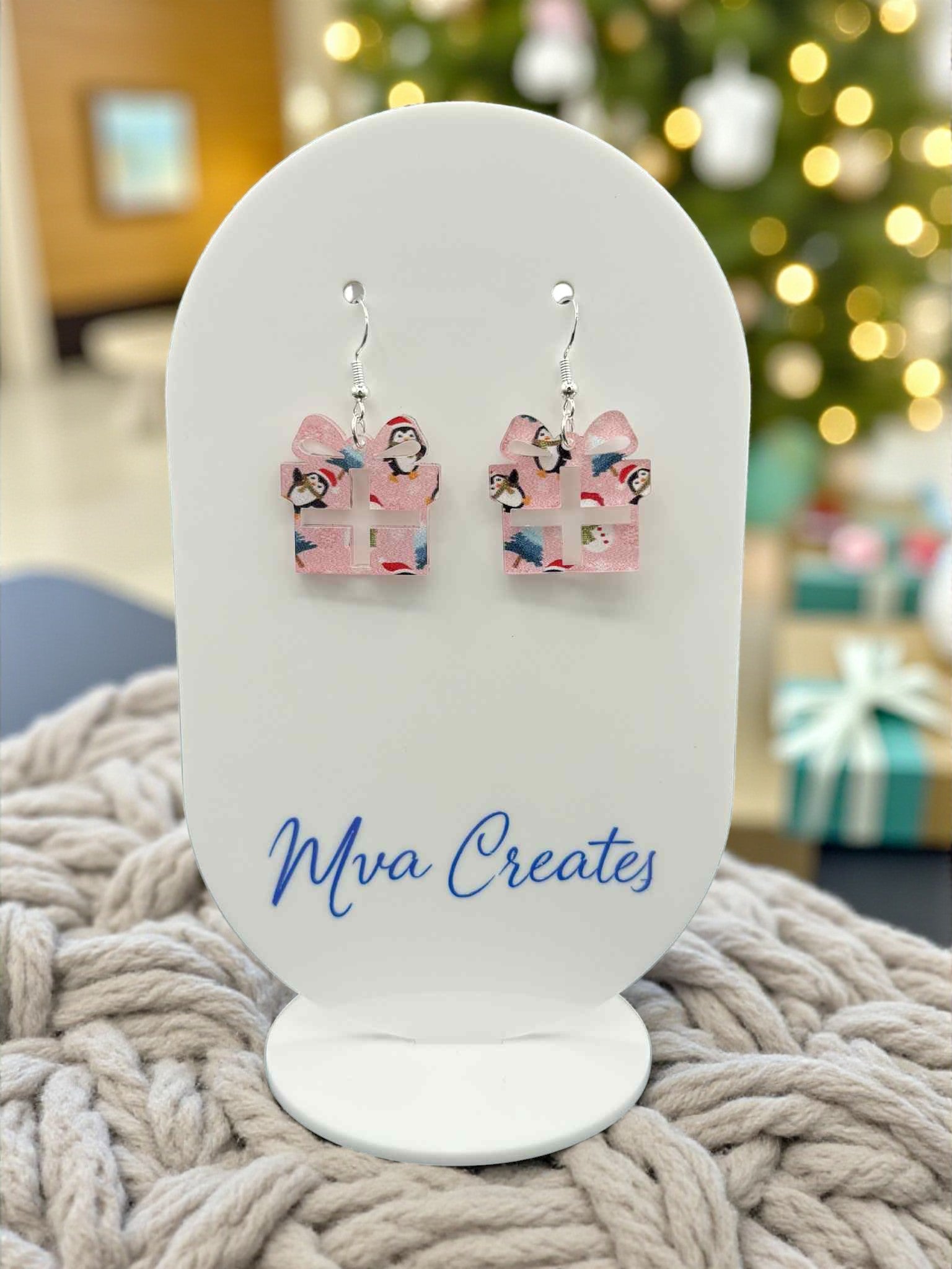 Pink Penguin Gift Box Earrings | Cute Christmas Acrylic Jewelry | Festive Holiday Gift for Her